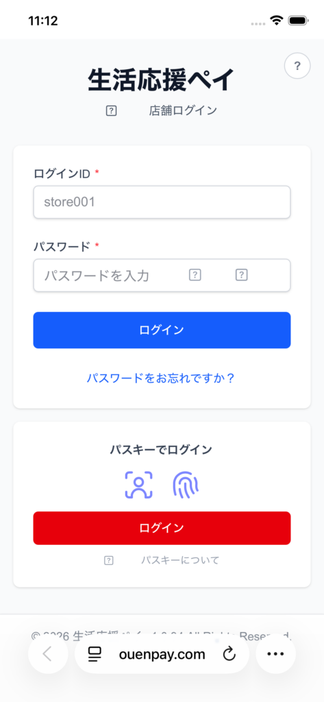 - 自治体から通知された店舗コード(ログインID)とパスワードを入力